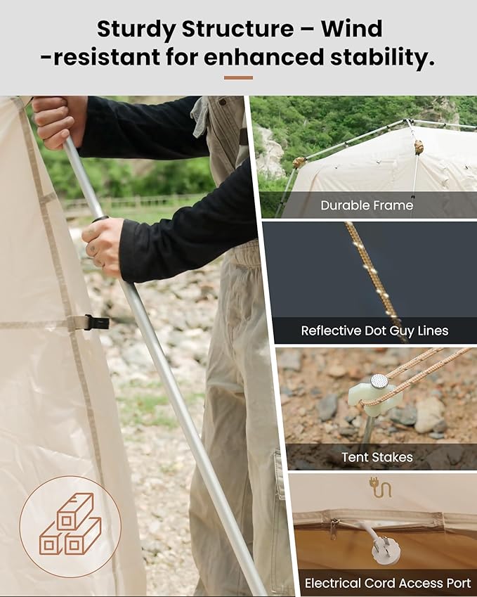 - CONVENIENT FEATURES: Designed for ease and comfort, this tent includes a built-in power port for easy access to electricity, hooks for hanging lanterns or gear, and internal storage pockets to keep your personal items organized. Perfect for both quick weekend trips and longer camping stays.