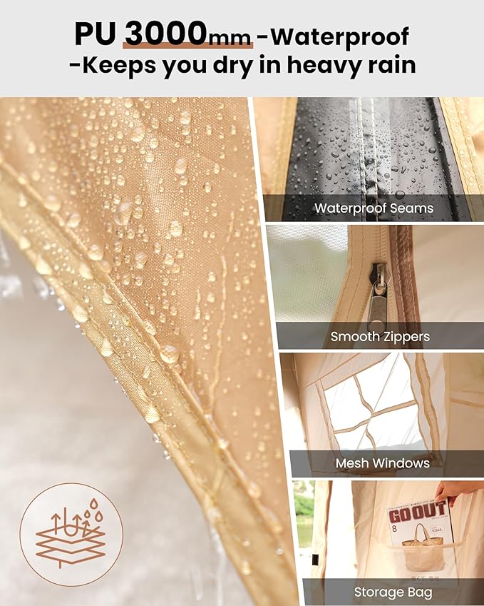 - WATERPROOF & UV-RESISTANT: Crafted from durable 210D Oxford fabric with a black PVC coating, this tent offers superior weather resistance. It boasts a 3000mm waterproof rating to keep you dry during moderate to heavy rain and provides UPF 50+ protection, shielding you from harmful UV rays for all-day comfort.