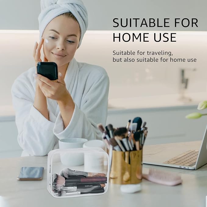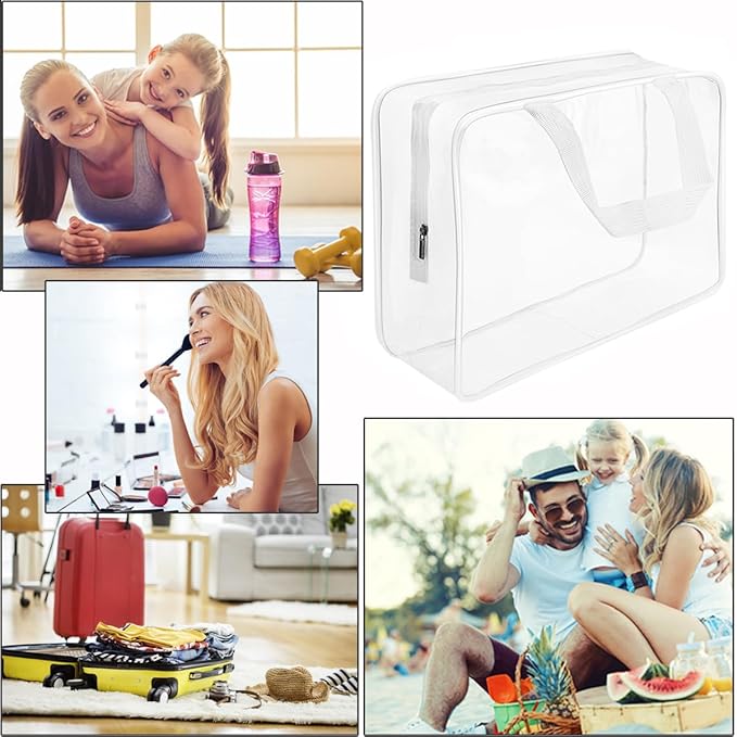 - Improved 0.6mm thickened transparent PVC material, softer and more pliable, durable and reusable; 4 PACKS 3 DIFFERENT SIZES: 1x Large clear toiletry bag (11.8" x 3.9" x 8.7"), 2x Medium clear makeup bag (9.5" x 1.9" x 7.9"), 1x Small clear cosmetic bag (7" x 1.6" x 5.5")