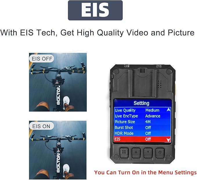- 【EIS Tech】The Ponycam body camera uses Electric Image Stabilization (EIS) to prevent blurring of the image caused by bodycam shaking during the filming process, thus recording high-quality audio and video. This feature is turned off by default, you can turn this feature on in the menu settings.