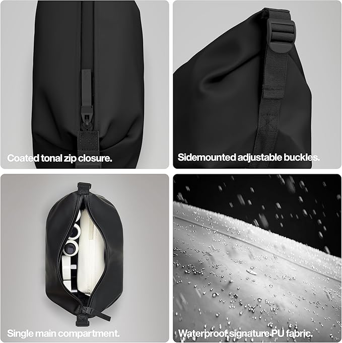 - WATERPROOF: This waterproof wash bag is characterized by its minimal silhouette accented by side mounted buckles. The buckles can be adjusted to compress the design. The feature keeps contents in place, while helping to make the best use of luggage space. The wash bag features a roomy main compartment with ample room for daily wash and grooming items.