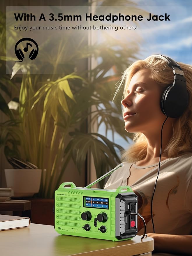 - MULTI-USE & DURABLE- The upgraded crank radios with a 5000mAh li-ion battery is enough to charge your cell phone or USB devices for a brief call or a text message during an emergency. And plus a 3.5mm headphone jack, allows you to enjoy radio shows without disturbing others. This weather radio with 3W integrated flashlights and 2.5W reading lamp are handy during emergency power cuts to see any signal in the dark. can be a lifesaver during dangerous disasters like tornadoes and hurricanes.
