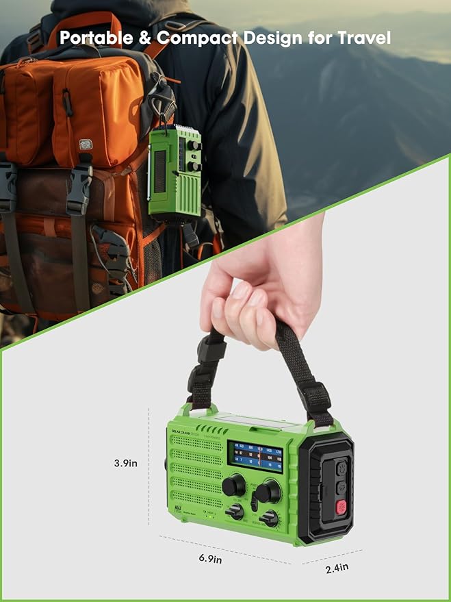 - PORTABLE RADIO & COMPASS - This pocket-sized portable emergency radio is surprisingly small and light. Its dimension is 7.5*3.5*4.7inch and weight 1.2LB, and it comes with SOS alarm function and a necessary compass.For hiking or trekking purpose this type of radio is a smart choice. Carrying around a large unit is quite difficult when you have to move around during emergencies.