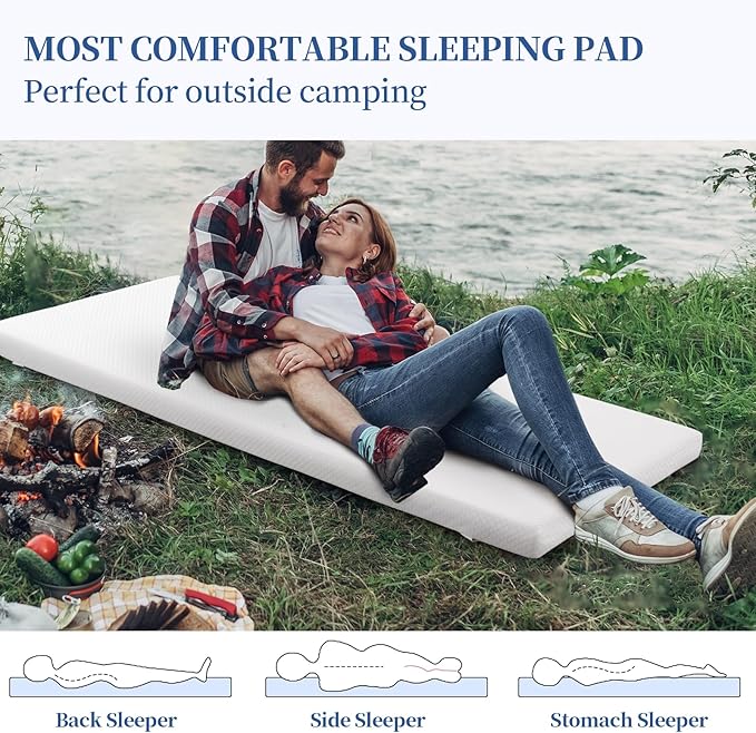 - 【PORTABLE DESIGN】The memory foam camping mattress rolls up easily for storage and travel. The lightweight mat is easy for you to carry. Equipped with storage strap for backpacking, hiking, road trips or yoga classes, etc.Our memory foam sleeping pad measures 72’’ Length, 24’’ Width and 3’’ Height to fit more persons and packing straps are included.