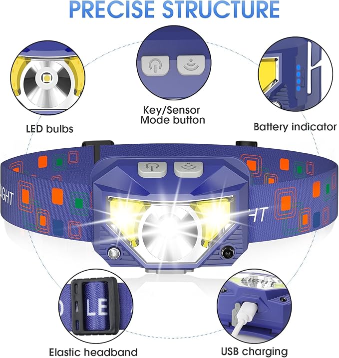 - Long Press Function and Motion Sensor: Unlike the old version, LHKNL headlamp has added a long press function. Just hold the key mode button for 3 seconds to turn off from any lighting mode—no need to cycle through all modes. It also added motion sensor mode, you can easily turn the lights ON or OFF by waving your hand, which is more convenient and avoids soiling the headlamp when your hands are dirty
