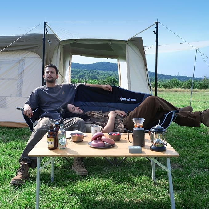 - 【Heavy-Duty Build】Engineered with reinforced steel tubing, 600D tear-resistant Oxford fabric, and a triple vertical leg support system, this heavy duty camping loveseat is made to handle real adventure. Anti-slip foot pads, crossbar reinforcements, and secure buckle anchors provide unbeatable stability.