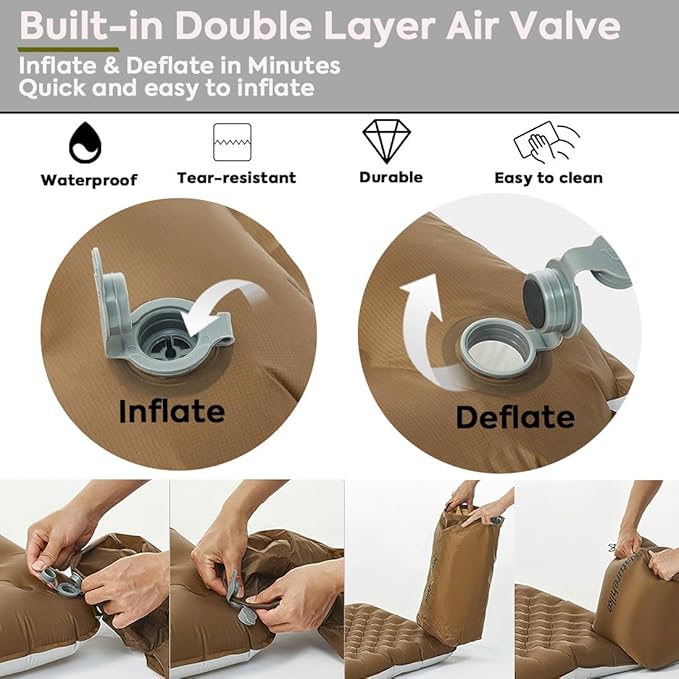 - 【Easy to Inflate and Deflate】Our sleeping pad has a double-layer air valve and comes with a manual inflatable bag that makes inflating and deflating quick and easy. Opening only the outer layer allows one-way inflation and prevents air leakage, while fully opening both layers allows for rapid deflation, deflation is as easy as opening the valve and pushing out the air.
