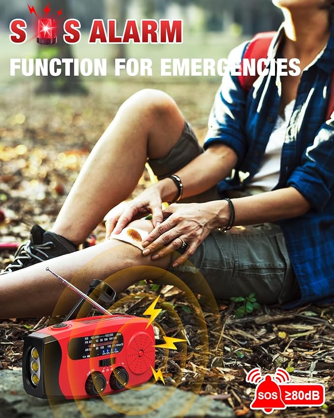 - 【 SOS Alarm Function for Emergencies 】This emergency hand crank radio has been upgraded to include a SOS distress function. When stranded in a snowstorm or hurricane, you can press and hold for 3 seconds to sound a siren louder than 80 decibels to attract the attention or help of rescuers.