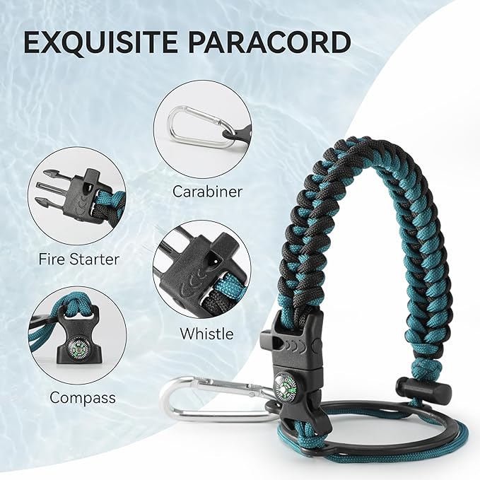 - 【FULL-FUNCTION PARACORD】This insulated water bottle comes with a beautiful hand knit nylon paracord. With compass, carabiner, flint fire starter and whistle. Three-finger wide handle can balance the gravity of the water bottle during walking, and you will not feel pain in your fingers. A carabiner enables you to carry it with ease or attach it to a backpack.