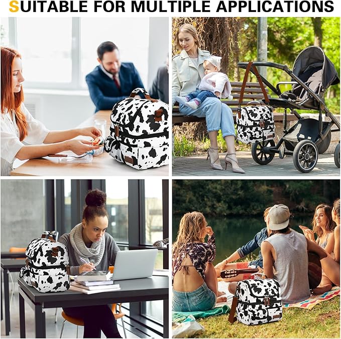 - 【Stylish&Cute Cow Print Design】Lokass women's lunch bag is designed with cow print, and its cute and fashionable appearance is very much in line with the aesthetics of the youthful and beautiful young people. The brown handle strap makes it reveal a touch of classic in the cute, and the adjustable shoulder strap also provides you with a variety of convenient carrying methods which makes it a great choice for work on weekdays!