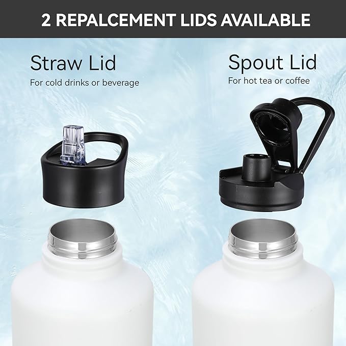 - 【SPOUT LID & STRAW LID】This 64 oz stainless steel water bottle comes with spout lid and straw lid, two different lids are complete LEAK PROOF & design for easy drink. Use the one with the mouthpiece for hot drinks, and the one with the straw for cold beverages. Wide mouth design allows for hassle-free bottle cleaning and ice adding.