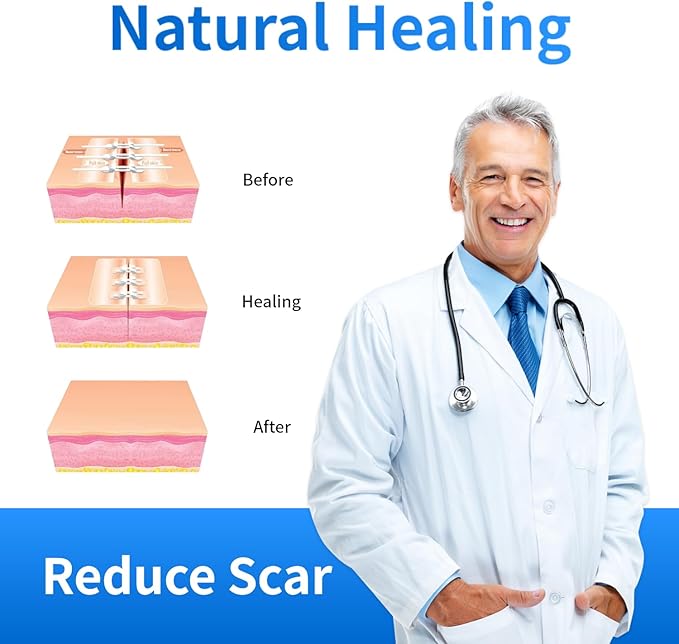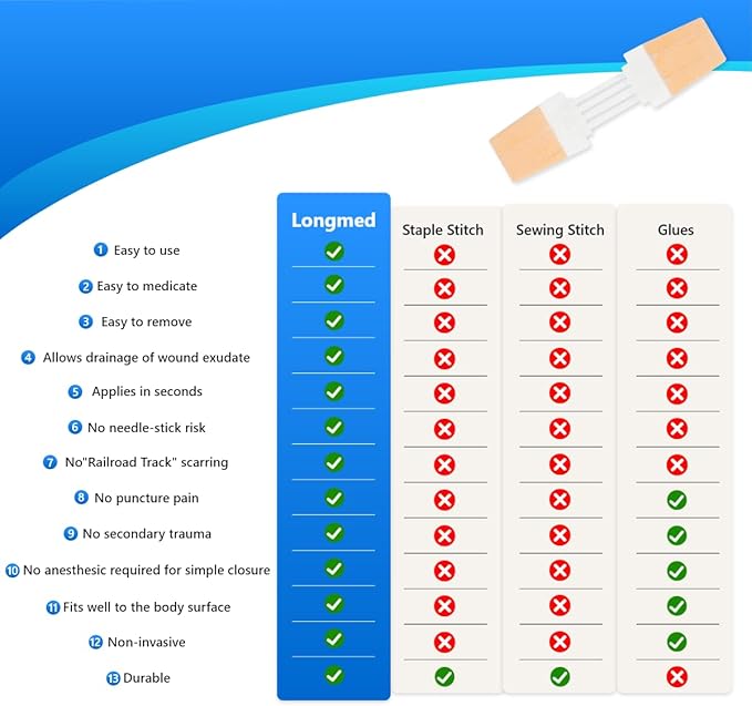 - Strong and secure wound closure with hypoallergenic materials and professional adhesion. Eight times stronger than traditional stitches, ensuring the wound is protected and securely closed.
