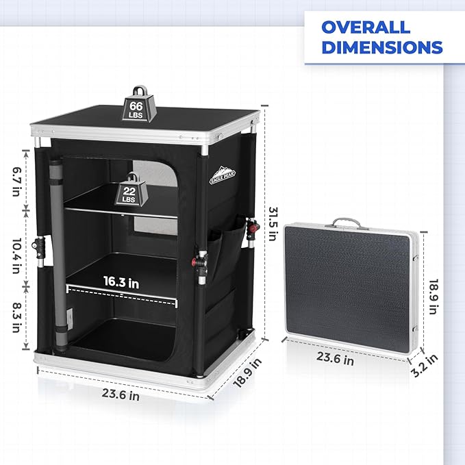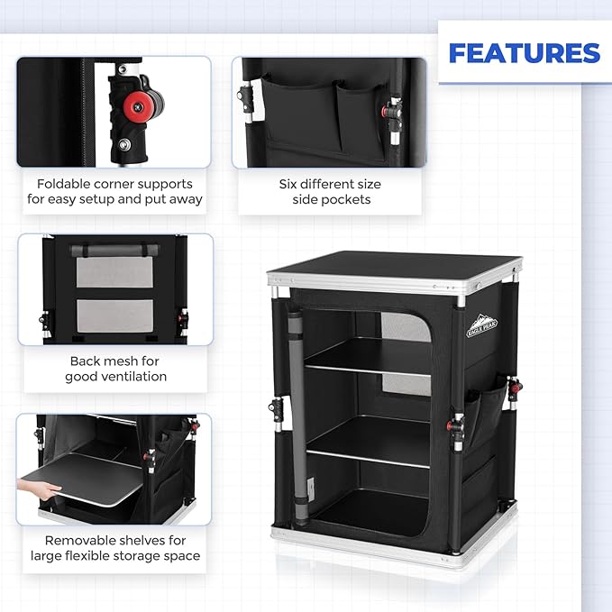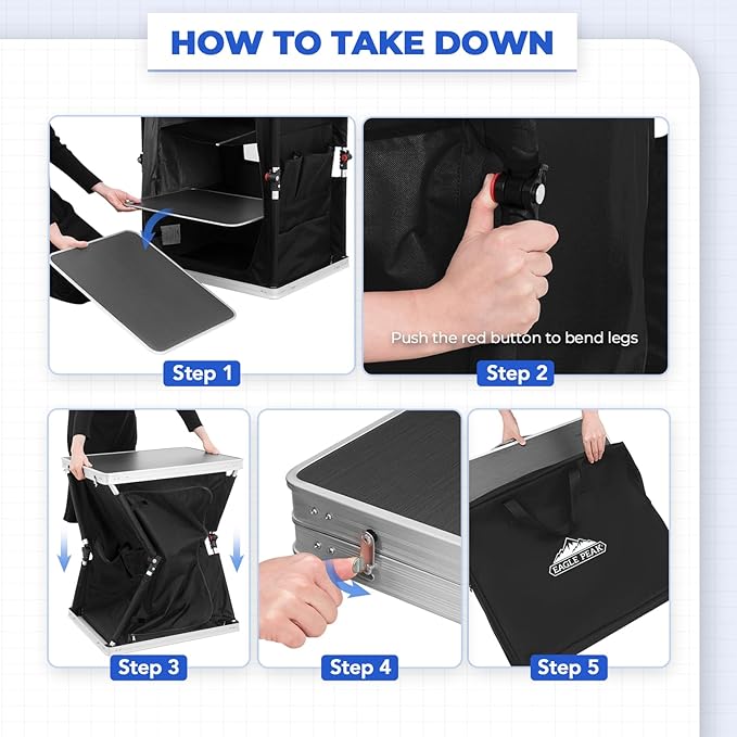 - BREATHABLE & EASY TO CLEAN: EAGLE PEAK portable camping table’s waterproof desktop and the 3 level shelves can be conveniently removed to clean when dirty. 2 mesh backside windows provide breathable airflow. NOTE:the table should not be used in the rain.
