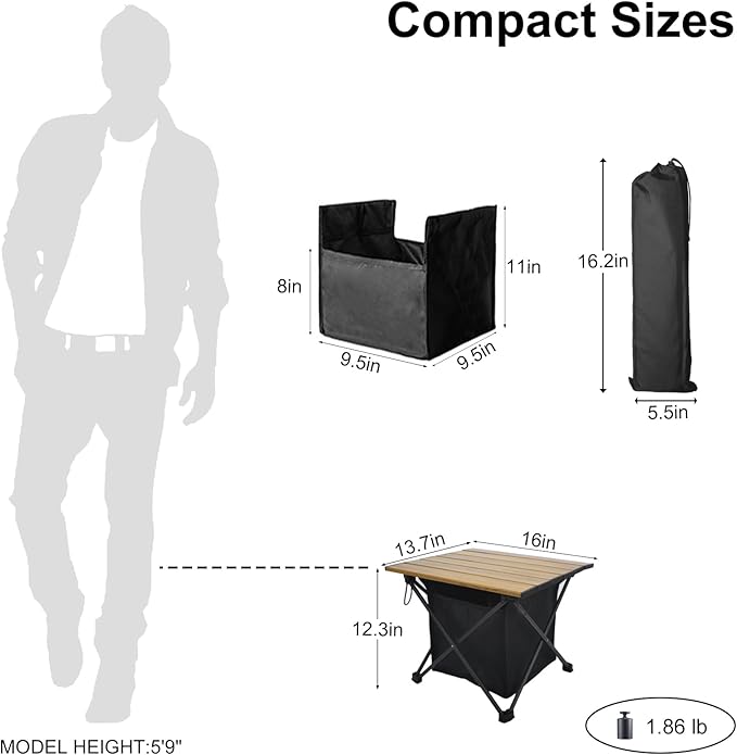 - Large Capacity: The storage bag under the folding table is made of strong 600D polyester, it's large enough to hold 4-6 bottles of beer, 6-8 packs of snacks, coffee bags, cups and so on. You can also put your ipad and phone in extended side pocket under pop up table. Enjoy a neat and comfortable outdoor travel