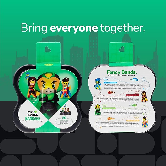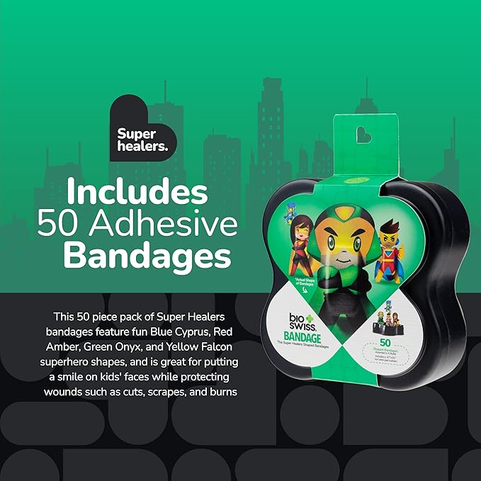 BioSwiss Bandages, Super Healers Superhero Shaped Self Adhesive Bandage, Latex Free Sterile Wound Care, Fun First Aid Kit Supplies for Kids and Adults, 50 Count
