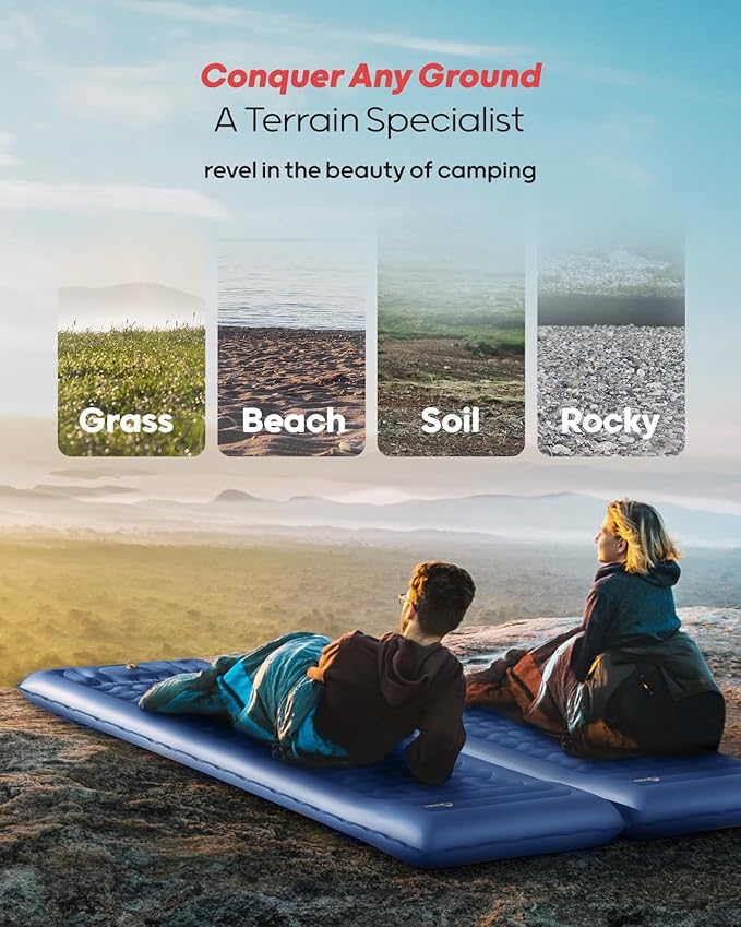 - Enhance Your Camping Sleeping Experience: The revolutionary inside design of this camping mat is intended to provide you with a cloud-like sleeping experience. Due to its improved internal structure, the inflatable pad can prevent the situation from contacting the ground even when supporting up to 800 pounds.