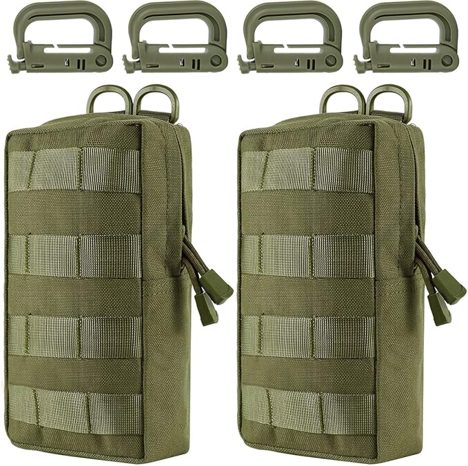 - WHAT YOU GET: The package contains 2 molle pouches, 4 quick release Carabiners. We offer fully functional tactical pouches. The military pouch connected to the Molle system can be used in combination with other equipment and accessories. You can also let your imagination run wild and attach it to your bike/motorbike or add it to your companion dog's waistcoat.