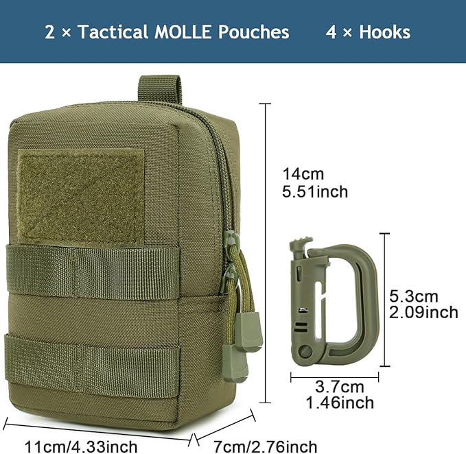 - WHAT YOU GET: The package contains 2 molle pouches, 4 quick release Carabiners. We offer fully functional tactical pouches. The military pouch connected to the Molle system can be used in combination with other equipment and accessories. You can also let your imagination run wild and attach it to your bike/motorbike or add it to your companion dog's waistcoat.