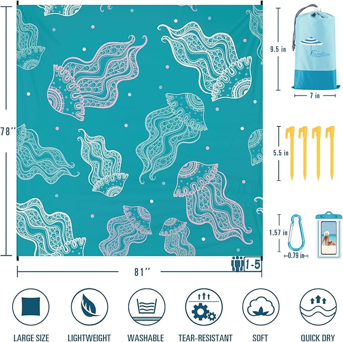 • 🌴BEACH BLANKET SANDPROOF WATERPROOF:78''×81'' fits 1-5 adults.Made with ripstop 210T polyester.The sand will fall down when you shake the blanket.The little water left behind will dry out in minutes.
