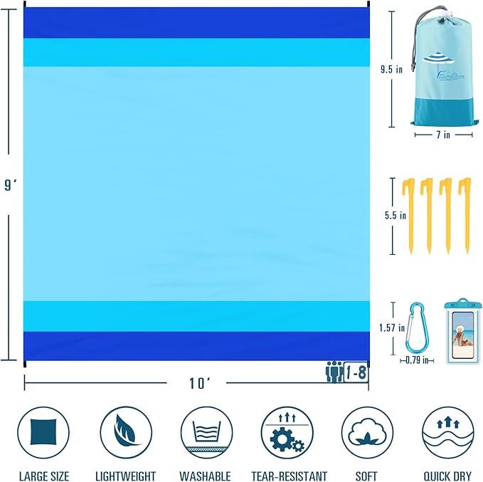 - 🌴BEACH BLANKET SANDPROOF WATERPROOF:10'×9' fits 1-8 adults.Made with ripstop 210T polyester.The sand will fall down when you shake the blanket.The little water left behind will dry out in minutes.