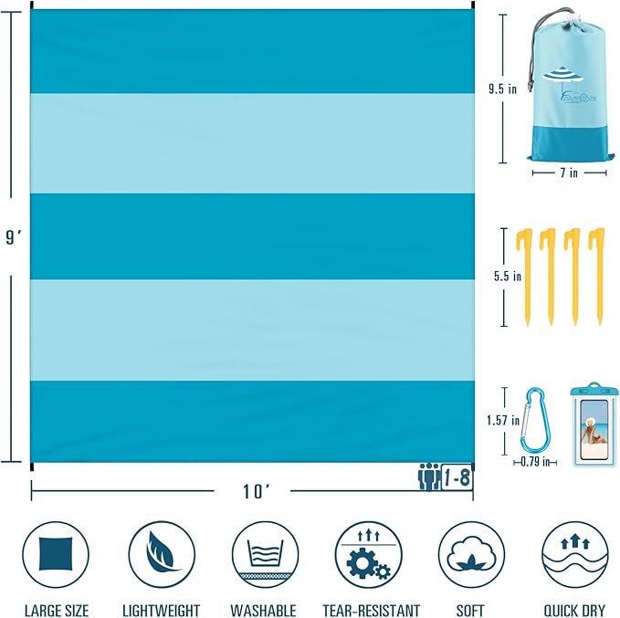 - 🌴BEACH BLANKET SANDPROOF WATERPROOF:10'×9' fits 1-8 adults.Made with ripstop 210T polyester.The sand will fall down when you shake the blanket.The little water left behind will dry out in minutes.