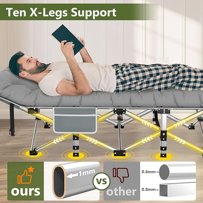 - Heavy Duty Cot Bed: Camping cot is designed with tubular iron legs,Upgrade with 10 legs,25mm thickened oblate square tubes that adds the travel cot to best stability and carrying capacity. It easily supports up to 500 lbs at most. Perfect for tall and large size heavy people.