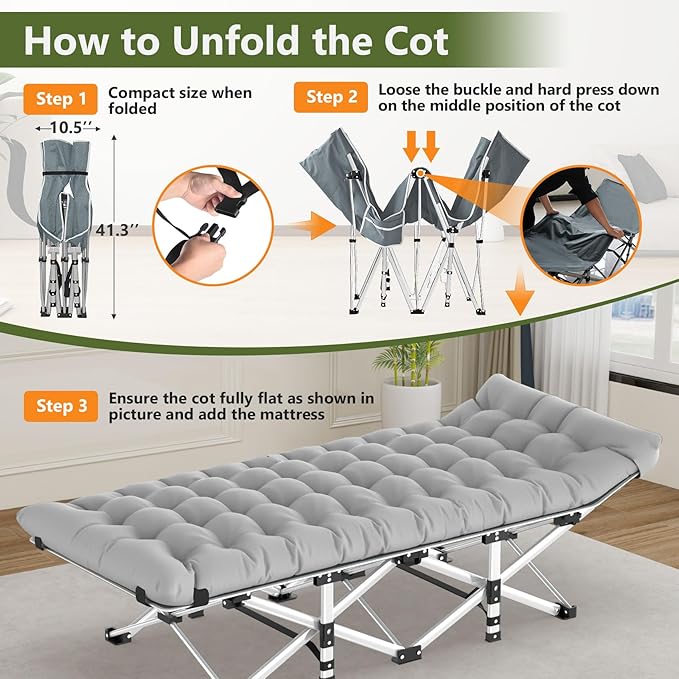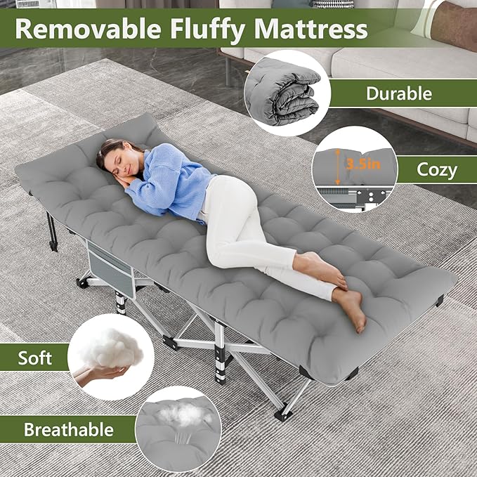 - Double Layer Polyester: Sleeping cot is constructed in a upgrade 600D Double Layer Oxford for superior strength, water resistance and easy cleaning, equipped with removable cot mattress, add more comfy and soft.