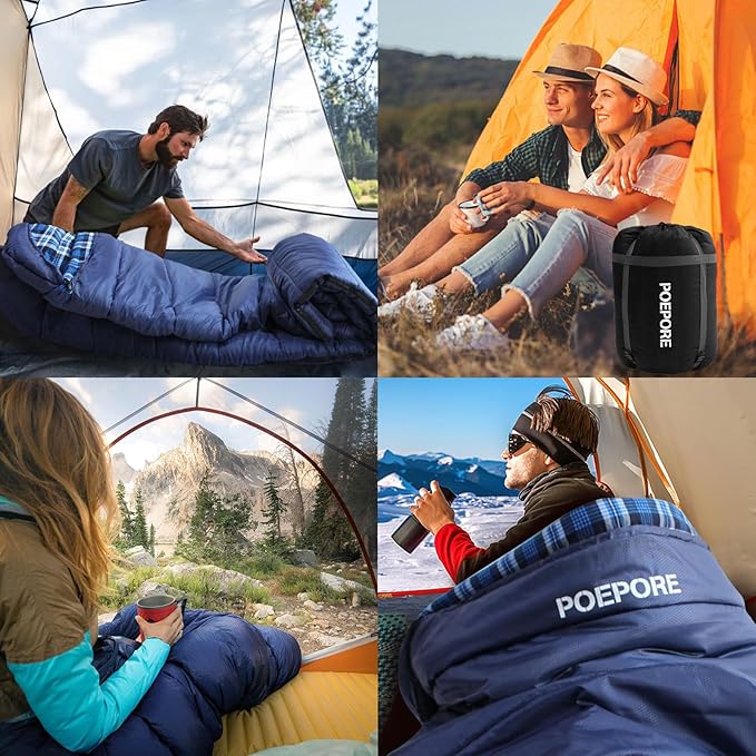 - Multiple Scenes: The sleeping bag comes with a compression bag, allowing easy rolling and convenient portability. Whether it's camping, traveling, outdoor adventures, or indoor overnight stays, the sleeping bag provides a comfortable sleeping environment. It also offers additional insulation in lower temperatures or harsh environments, protecting users from cold or damp conditions. Therefore, the POEPORE sleeping bag is an essential piece of equipment for outdoor enthusiasts and travelers.