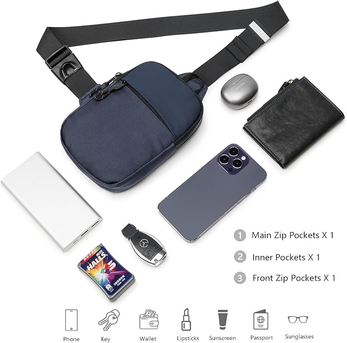 - Practical Capacity: This lightweight sling chest bag has 1 main zip pocket and 1 front zip pocket. The main zip pocket contains 1 mesh inner pocket. Stay organized with multiple compartments. Enough capacity to hold power bank, ID cards, mobile phone, keys, cash, passport, earphones, etc