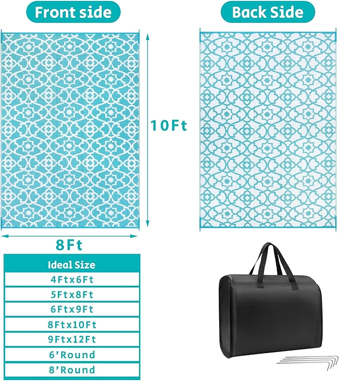 - XXL Large Reversible Outdoor Rugs: Featuring a classic moroccan pattern on both sides, this rectangular 8x10 ft outdoor area rug allows you to instantly refresh your patio, porch, backyard, deck, RV campsite. And this outdoor deck rug is reversible, two-sided design allows you to have two different looks,both sides can blend perfectly with nature and look very full and comfortable.