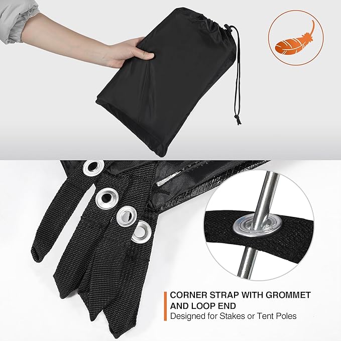 - Lightweight & Compact: With storage bag, the camping tarp can be packed into campact size (12.2x8x2” /31x21x5cm). Weighs only 0.88lbs/400g, lightweight to carry with.