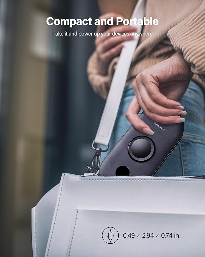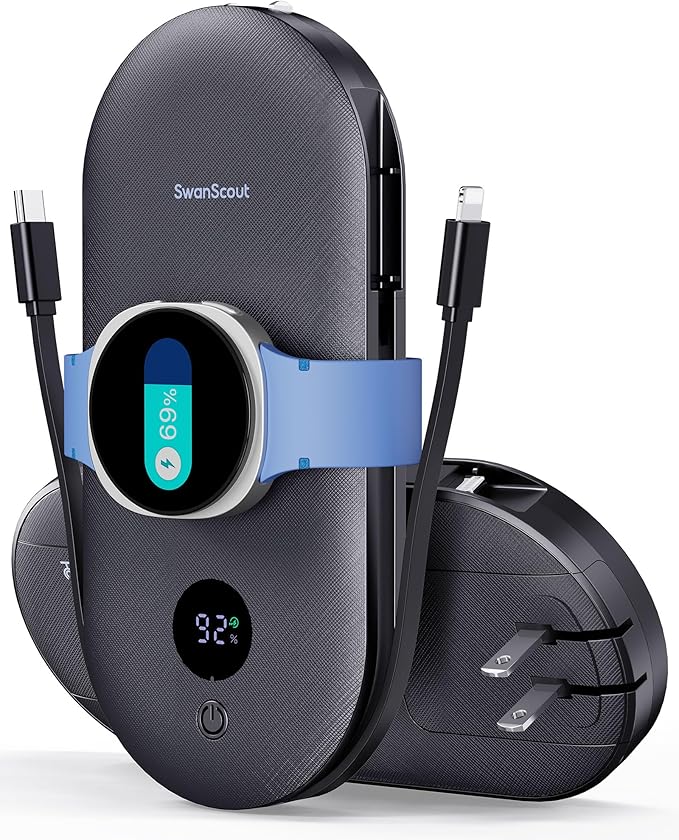 - Built-in Cables & Wall Plug - SwanScout 302S features built-in cables for all phone types and a convenient AC wall plug. Additionally, it includes a USB-C port for fast charging and recharging (Note: The additional USB-C output is not compatible with iPhone 15 series). The built-in AC wall plug allows for direct charging from a wall outlet, eliminating the need for extra cords while traveling