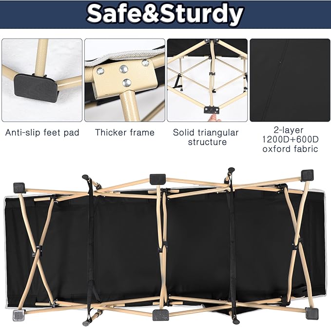 - Quality Material and Durable Construction: experience strength and durability with our folding camping cot, designed with a reliable steel tube bracket and a triangular structure; Crafted from 1200D and 600D oxford fabric, it is sturdy yet weighs only 13.2 lbs; Its robust steel frame can support a maximum capacity of up to 450 lbs, safe and reliable for adults