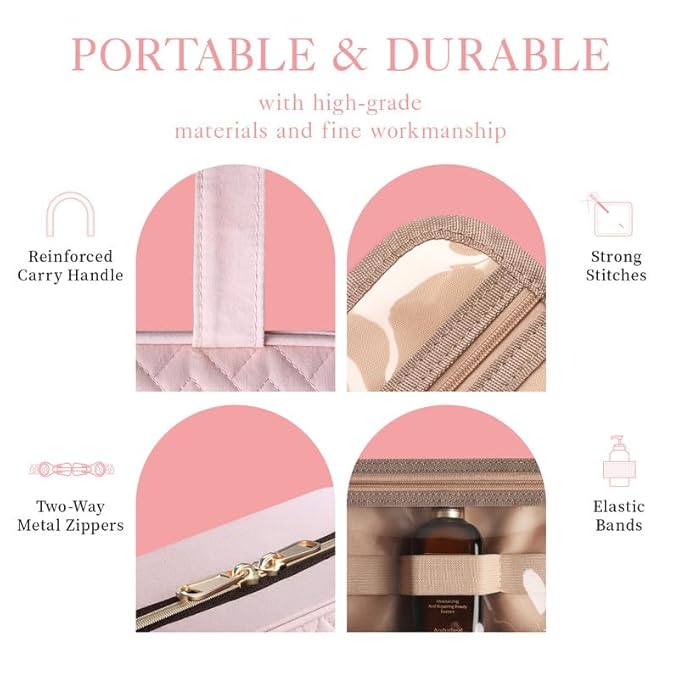 - USER-FRIENDLY DESIGNS: Designed with user convenience in mind, this travel bag for toiletries incorporates supporting pads to maintain its shape and provide excellent protection for the items inside. Elastic straps keep toiletry bottles upright, preventing liquids from escaping and causing a mess. The reinforced zippers enhance durability and ensure smooth opening, adding to the overall user-friendly experience.