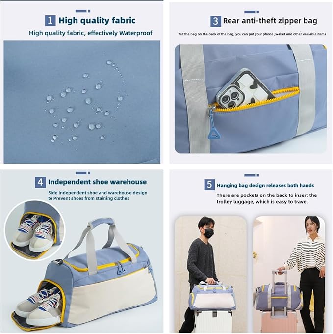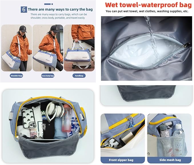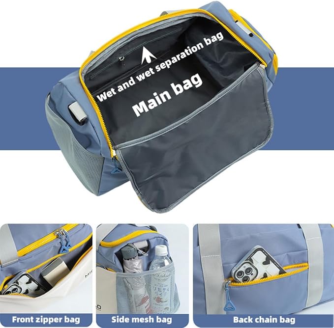 - 4. Wet and dry separation design: Our gym bag has a wet and dry separation design, which can keep your sweaty clothes and towels and swimsuits separately. There are dedicated compartments for shoes to separate dirty shoes from the rest of the equipment.