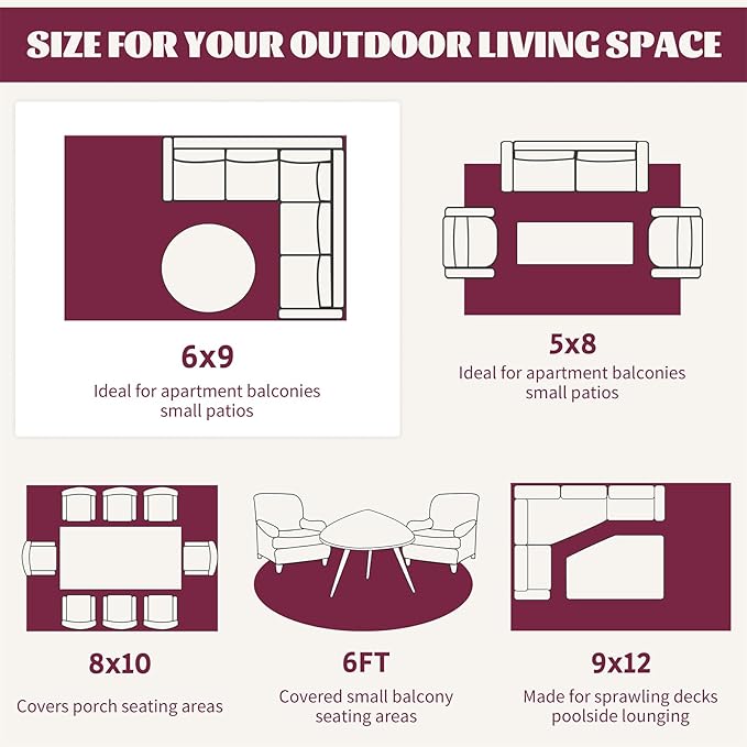 - Waterproof & Easy Cleaning: The outdoor/indoor rugs are water proof and easy to clean. Our rugs resist lots of stains: milk, wine, cola, grass and more. Simply sweep away dirt with water and the breathable design make it possible to airing dry in few minutes. If you are outside without water, you can just wipe it with cleaning cloth or shake it, rid the dust off. Great for keeping dogs out of the dirt.