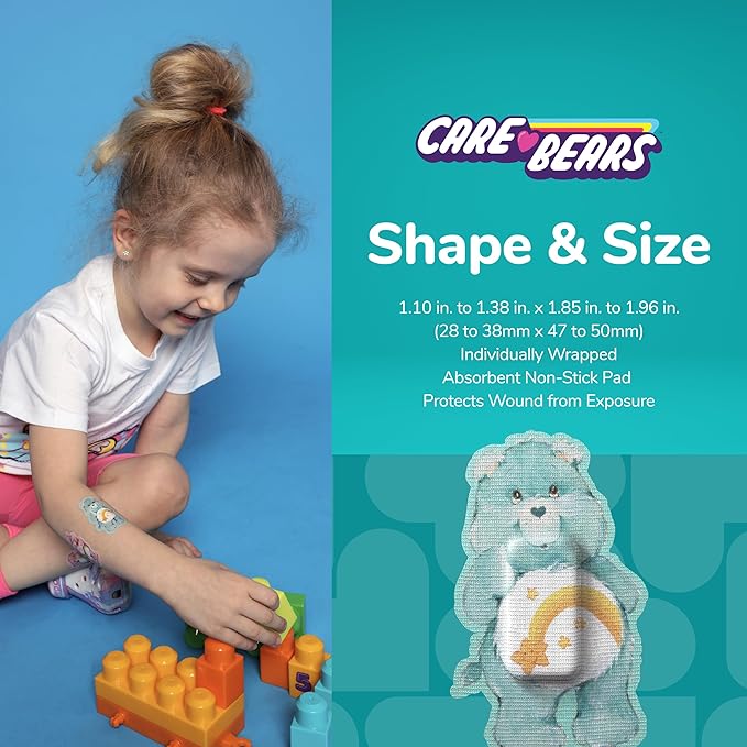 - SAFE PACKAGING: These sterile Care Bears cartoon character bandages come in cute and adorable packaging, and are individually wrapped for safe handling; small bandages help protect kids' sensitive wounds from coming into contact with dirt for first aid wound care