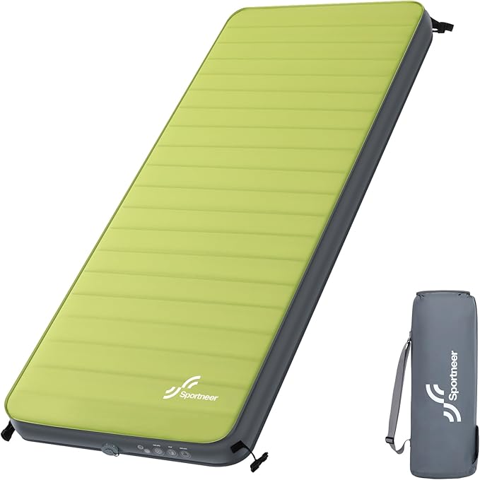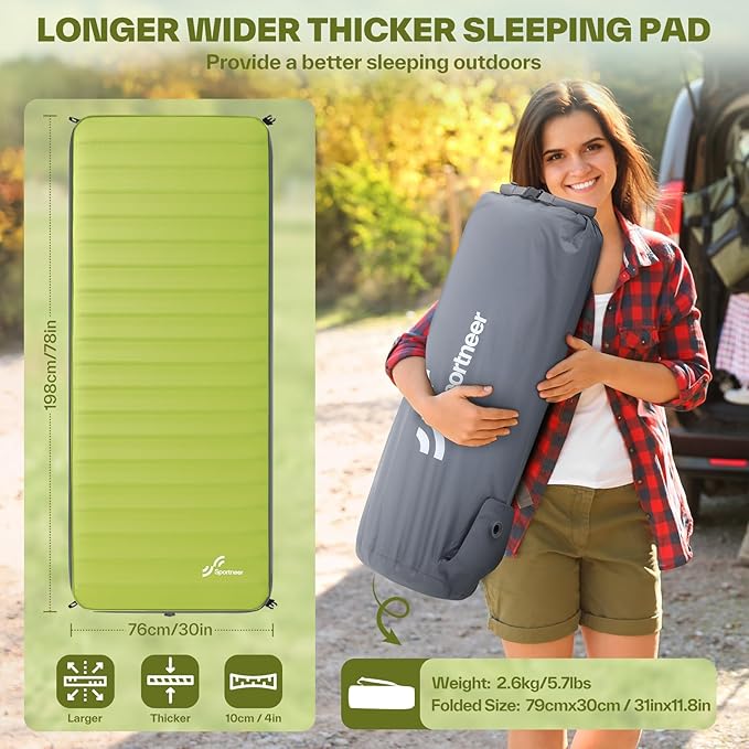 • Extra-Wide Comfort, 4"Support: Sportneer camping mattress pad measures 78" x 30" x 4" after inflation, making it larger and thicker than most camping pads on the market. This 4-inch thick foam camping mat can keep you comfortably elevated off hard ground, ensuring a restful sleep during outdoor adventures. Its special sponge structure delivers superior support while being 35% lighter than comparable mattresses—perfect for campers who refuse to compromise on comfort or convenience.