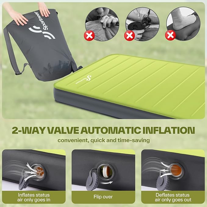 • Effortless Self-inflation, Customizable Comfort: Simply open the valve, Sportneer self-inflating air mattress will automatically inflate when you set up your tent. There is no need to use pumps, mouth or feet like other sleeping pads. You can also adjust the hardness of your sleep pad by controlling the inflation volume to ensure excellent comfort during your sleep.