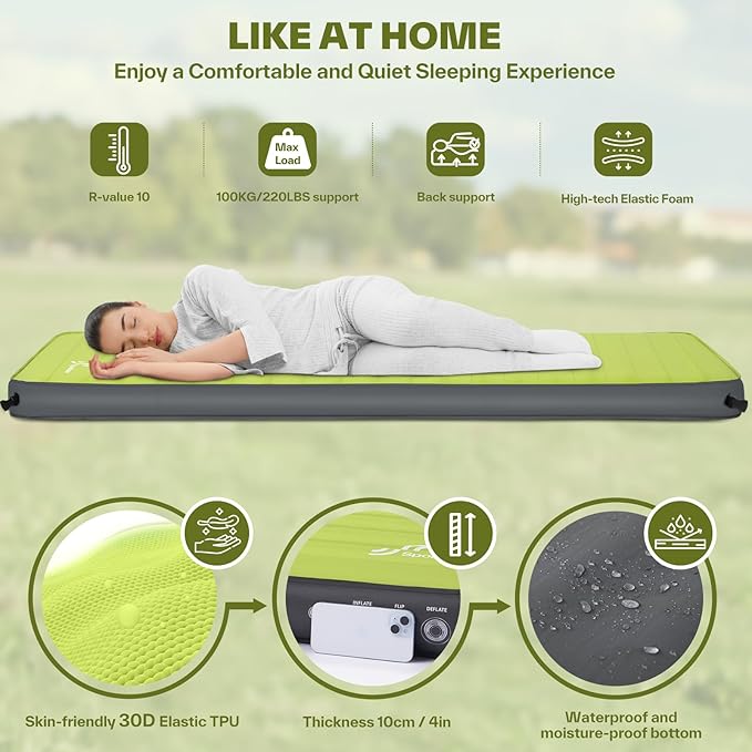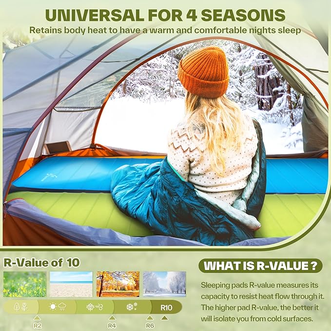 • R-Value 10 For All Seasons: Our self-inflatable camping sleeping pad has an R-value of 10, featuring outstanding heat insulation, moisture-proof and breathable properties. Its temperature retention capacity is three times that of ordinary materials and it can withstand harsh external environments. Suitable for use in all four seasons, it enables you to enjoy a comfortable sleep throughout the year when traveling with your family or friends.