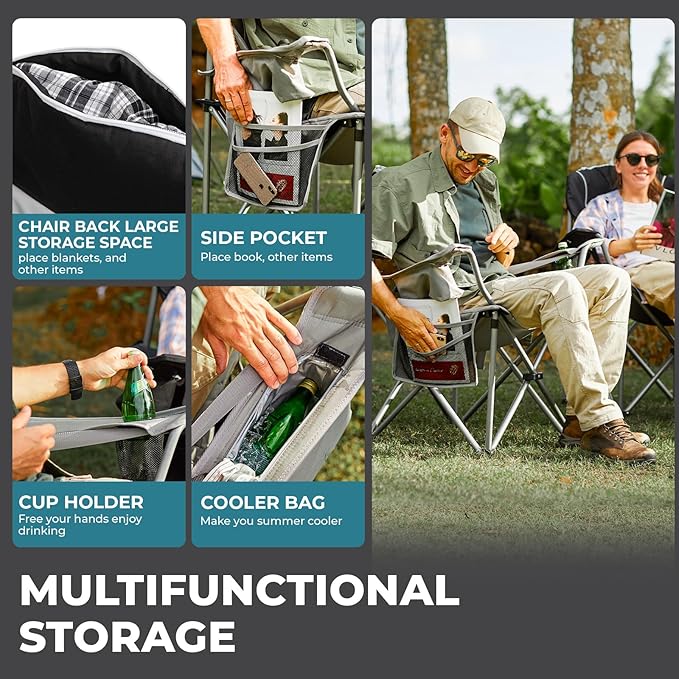 - Versatile for All Outdoor Adventures: Whether you're fishing, camping, tailgating, or enjoying a day at the beach, this chair has you covered. With features like side pockets for storing small items, cup holders on the armrests, and reinforced footpads for stability on various terrains, it's designed to handle all your outdoor activities with ease and convenience.
