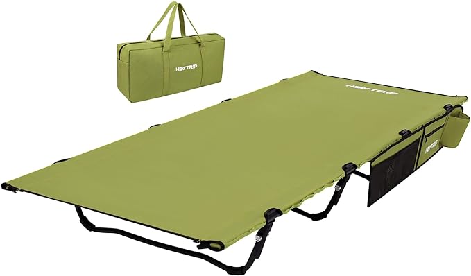 HEYTRIP Extra-Wide Camping Cot, Upgrade Sturdy Camping Bed, XXL Cots for Sleeping Support 500lb, Folding Cot with Side Pocket, Carry Bag Ultralight Backpacking Cot for Travel(Green)