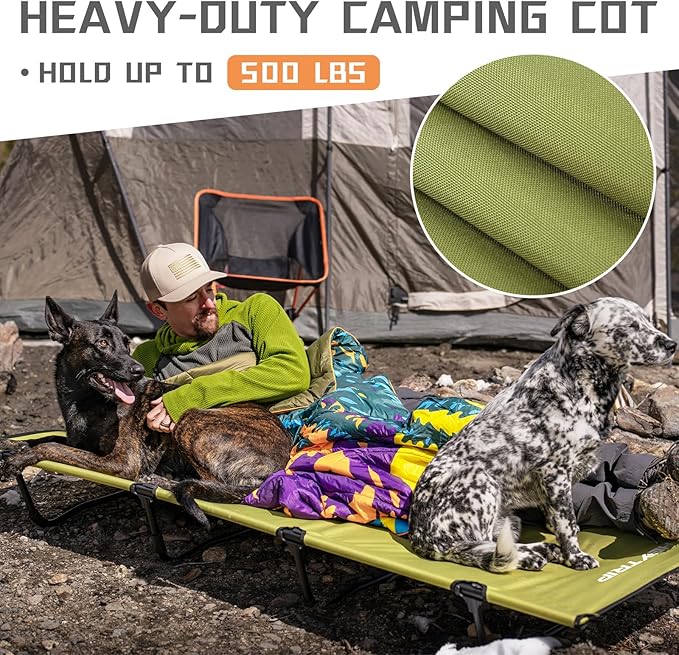 - Sturdy & Durable Ultralight Cot: Crafted from THICKER 7075 aluminum alloy, this sleeping cot frame is built to last, hold up to 500 LBS, you can rest easy. Its arc-shaped support design allows for stability on uneven or muddy ground throwing off your sleeping. Just turn around like at home and let the stabilizing non-slip mat do their thing and protects your tent.