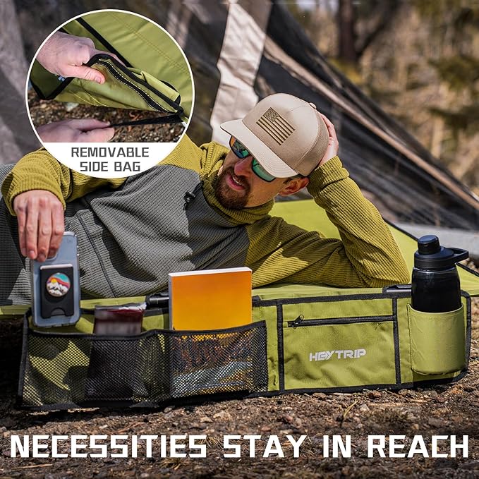 - Organized & Quick-access: camping cots for adults with roomy side pockets and MOLLE straps. The side pockets are detachable and can be moved to any seat of the side. You can keep your phone, books, water bottles, and other camp gear clean and dry. The MOLLE straps can attach camping essentials and giving you even more storage options within arm's reach.