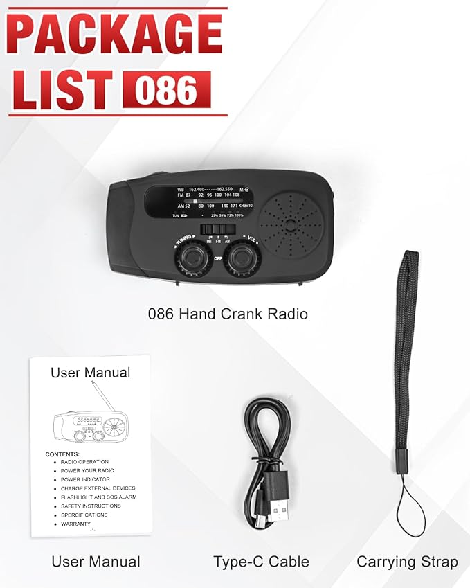 - 【 3-Way Power Sources for the Radio 】 This emergency hand crank radio can be charged via hand crank, solar panel and Type-C charge. There are 3 power backup options, making it easier to keep the emergency radio running for long periods of time.