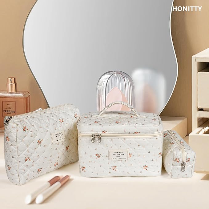 Makeup Bag,Quilted Cosmetic Bags,Large Floral Make Up Organize bag,Makeup Bag Set for Women,Flower Travel Toiletry Bag
