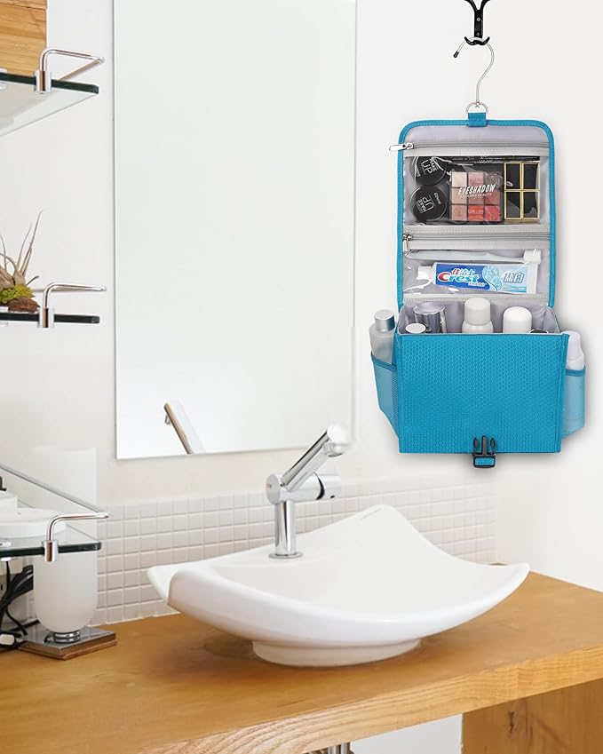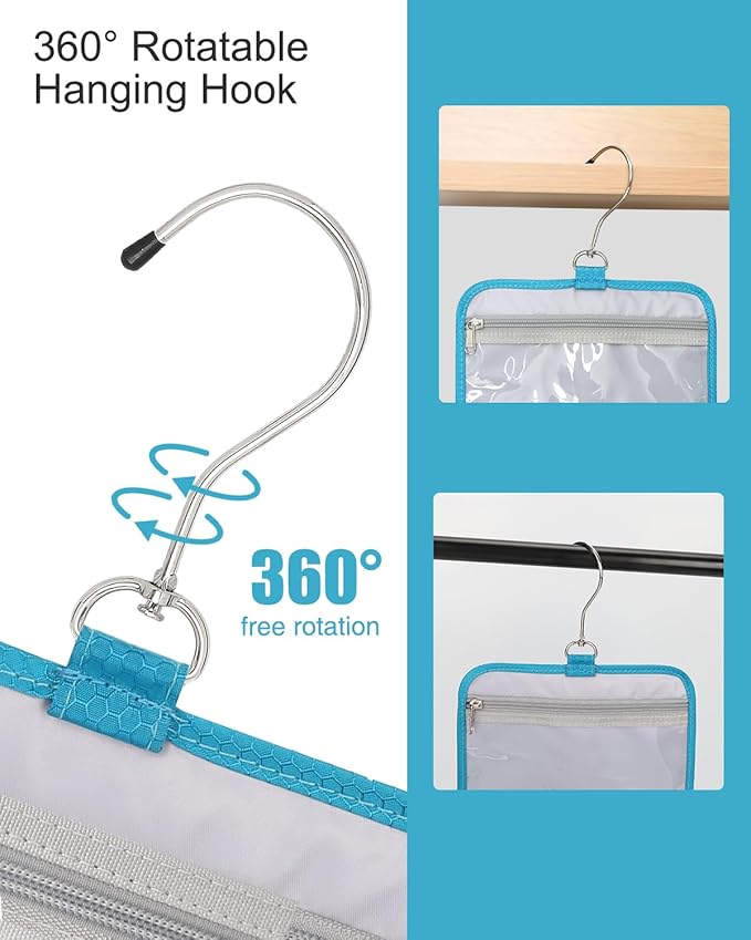 - 360° Rotatable Metal Hanging Hook: The travel toiletry bag with a 360° swivel non-slip metal hanging hook for versatile hanging options. It is big enough to allow you to hang it up on the bathroom, door, closet rod, door knob, etc.