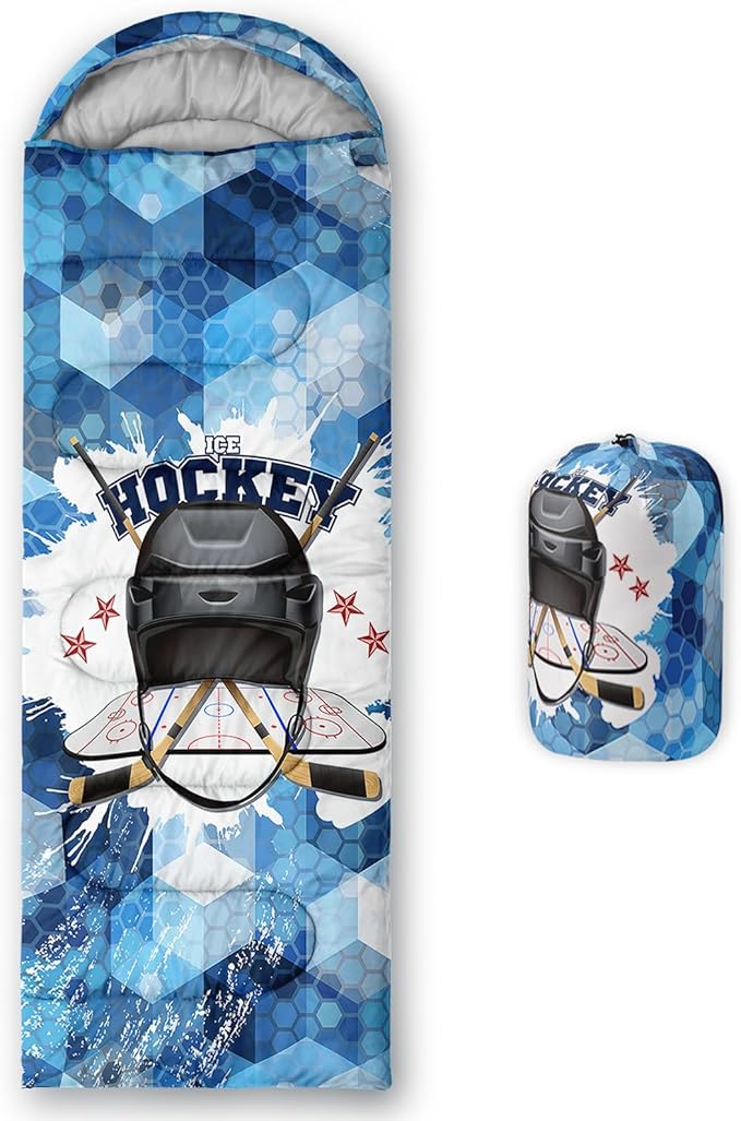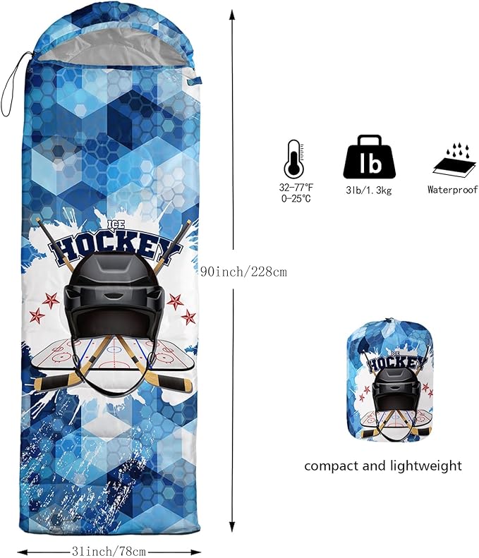 - 【Fits For 3 Seasons】: Size - 31 by 90 inches (W x D). Our Blue Honeycomb Hockey sleeping bag can be used in 3 seasons with a design temperature of 32℉-77℉(0℃-25℃). These Sleeping bags also have a weather resistant waterproof design to keep you warm and prevent you from any dampness.