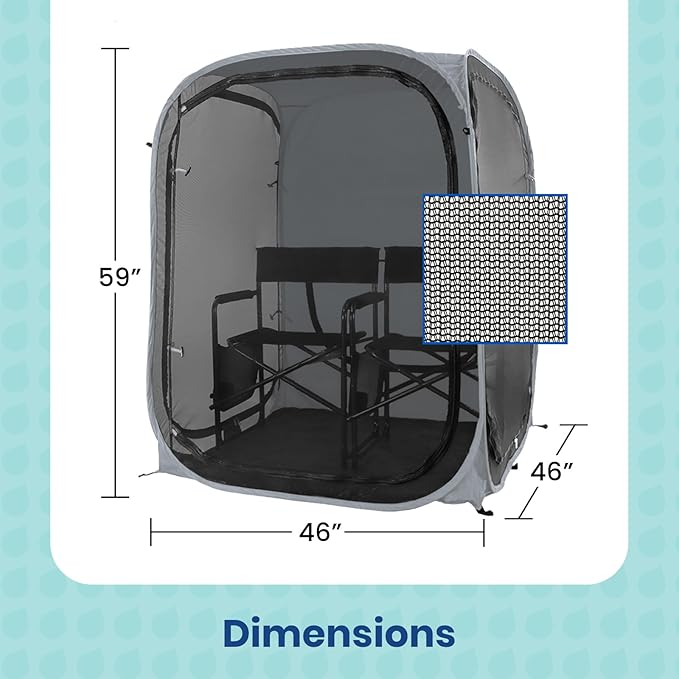 - Room to Spare: Our pop-up screen Pod is a cozy fit for up to two standard director or folding camping chairs, or one large camping chair, with plenty of legroom and space for a tote bag or small cooler