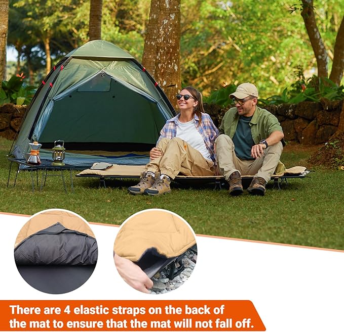 - SECURE FIT WITH ELASTIC STRAP DESIGN: The four elastic straps at each corner of the mattress pad help keep it securely attached to your cot. Say goodbye to restless nights and slipping pads. Whether you're resting in your tent, at a campsite, or indoors, this cot pad will stay in place for an uninterrupted night of sleep.